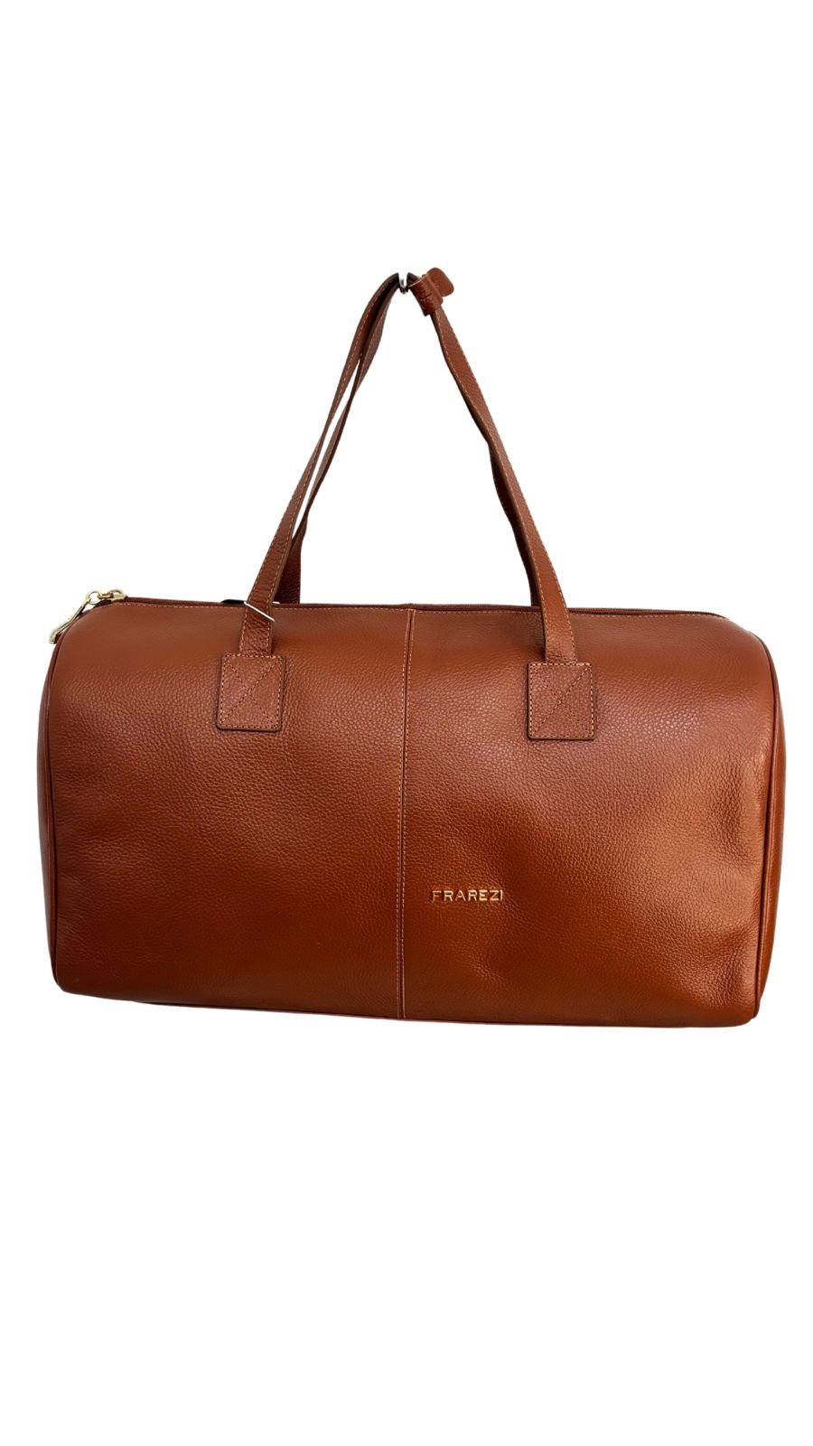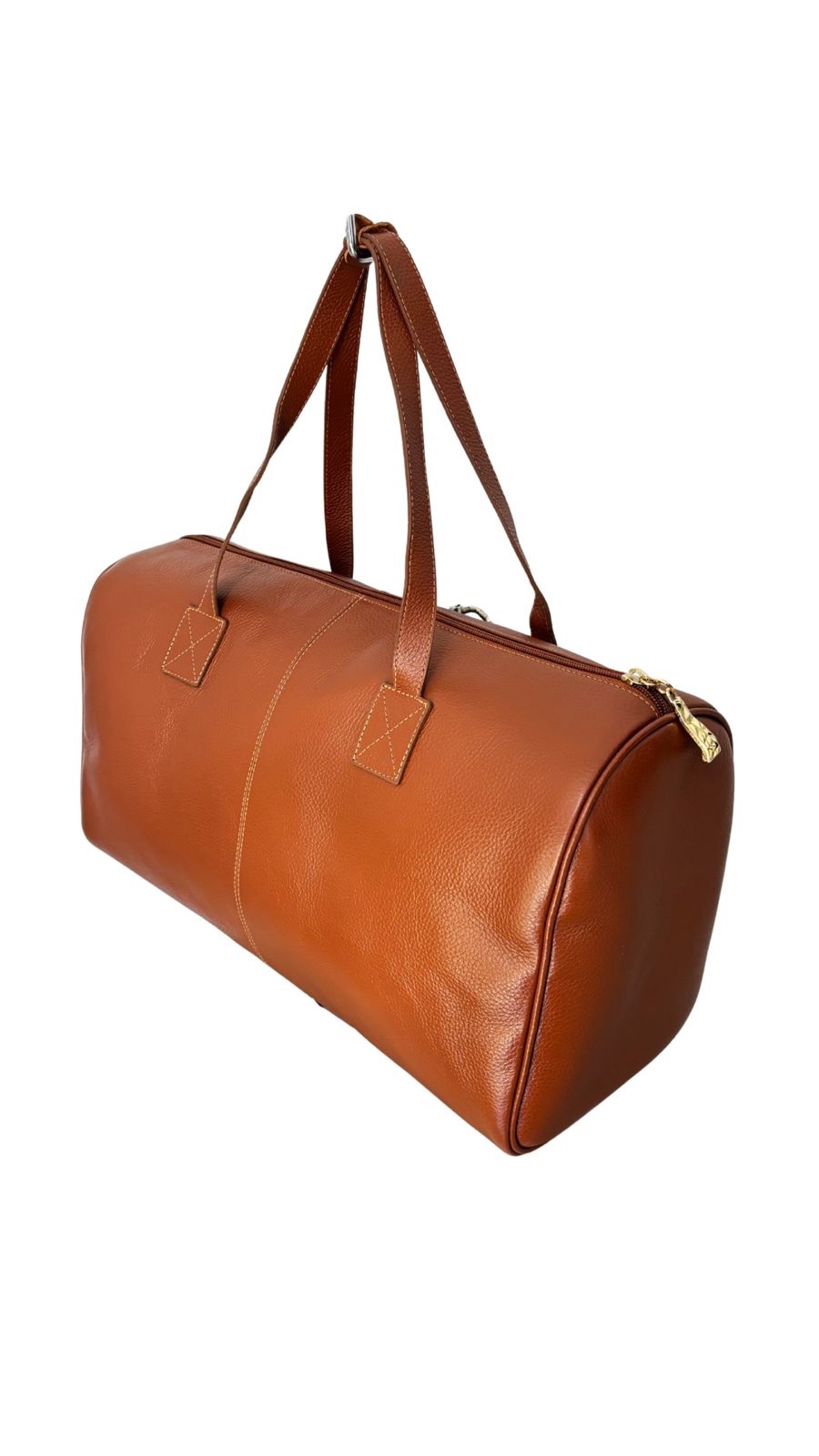 Bolsa de viagem / esportiva em couro, com alças de ombro reforçadas e fechamento em zíper dourado.